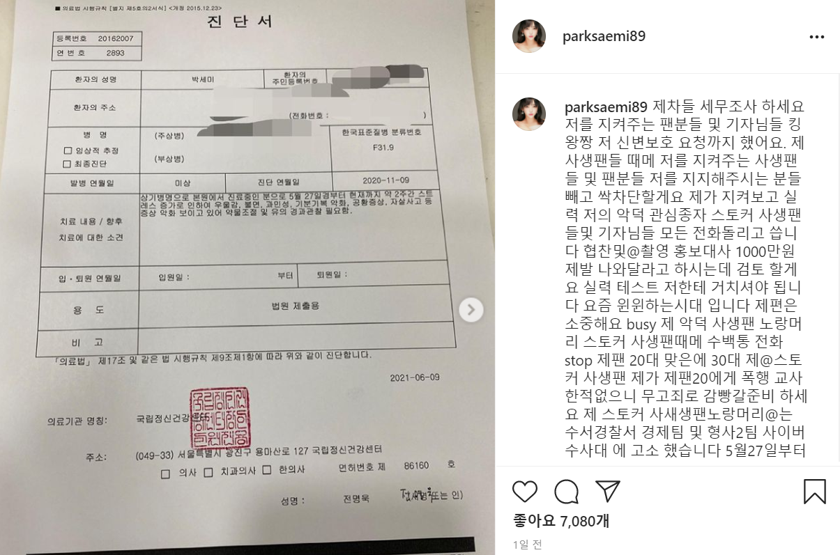 법원 제출용이라고 적힌 진아림의 진단서에는 ‘상기 병명으로 본원에서 진료 중인 분으로 5월 27일경부터 현재까지 약 2주간 스트레스 증가로 인하여 우울감, 불면, 과민성, 기분기복 악화, 공황증상 등 증상 악화 보이고 있어 약물조절 및 유의 경과관찰 필요함’이라는 의사 소견이 적혀 있습니다.