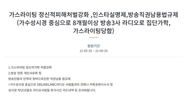 네티즌 A 씨는 최근 청와대 국민청원 게시판에 '가스라이팅 정신적피해처벌강화, 인스타실명제, 방송직권남용법규제(가수 성시경 중심으로 8개월이상 방송 3사 라디오로 집단가학, 가스라이팅 당함'이라는 제목의 글을 올렸습니다. 현재 원글은 삭제됐지만 온라인 커뮤니티 등에 내용이 퍼졌습니다.