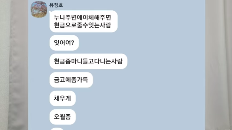 이어 지인에게 은행으로 이체를 해주면 현금으로 찾아 줄 수 있는 사람을 찾아달라고 부탁하는 카톡 메시지도 공개했습니다.