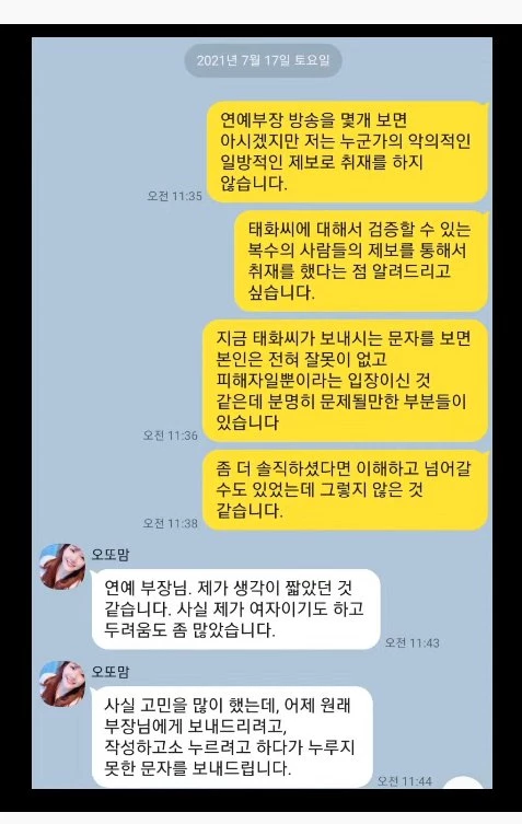 이후 두 사람은 카카오톡으로 대화를 나눴고 오또맘이 추가 해명을 위해 통화를 요청했다고 설명했습니다.
