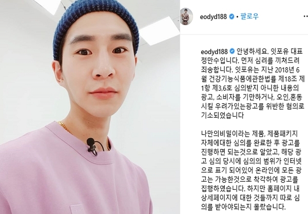 건강기능식품을 허위 과장 광고한 혐의로 벌금 500만 원을 선고받았고 이후 게재한 짧은 사과 영상에서 “정확히 말하면 사기를 친 건 아니다”고 말해 네티즌들의 공분을 샀습니다. 이를 접한 네티즌들은 “와 반성을 안하다니”, “정신 못차렸다.”, "구독 취소 한다."등의 반응을 보였습니다.