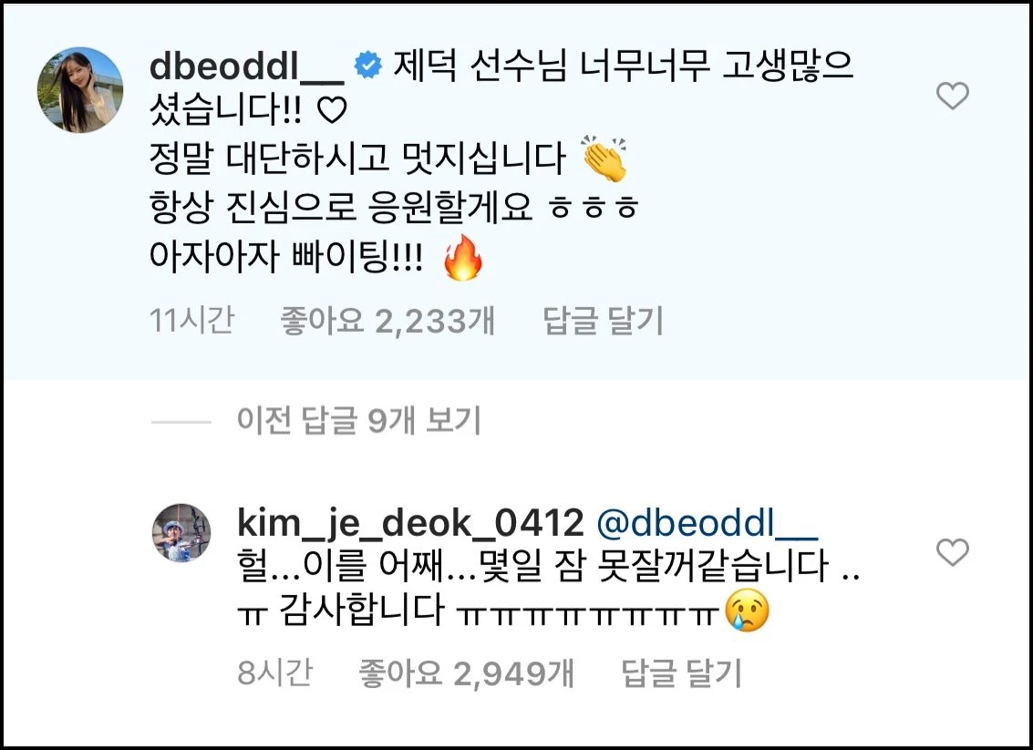 그러자 김제덕은 답 댓글로 "헐 이를 어째. 며칠 잠 못 잘 것 같습니다. 감사합니다"라며 눈물 흘리는 이모티콘을 덧붙였다.
