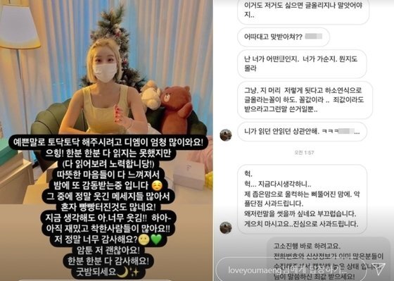 앞서 미용실서 시술 피해를 입은 사실을 알린 뒤 악플에 시달리고 있다고 밝힌 배우 맹승지는 악성 메시지들을 공개하며 법적 대응을 예고했습니다.