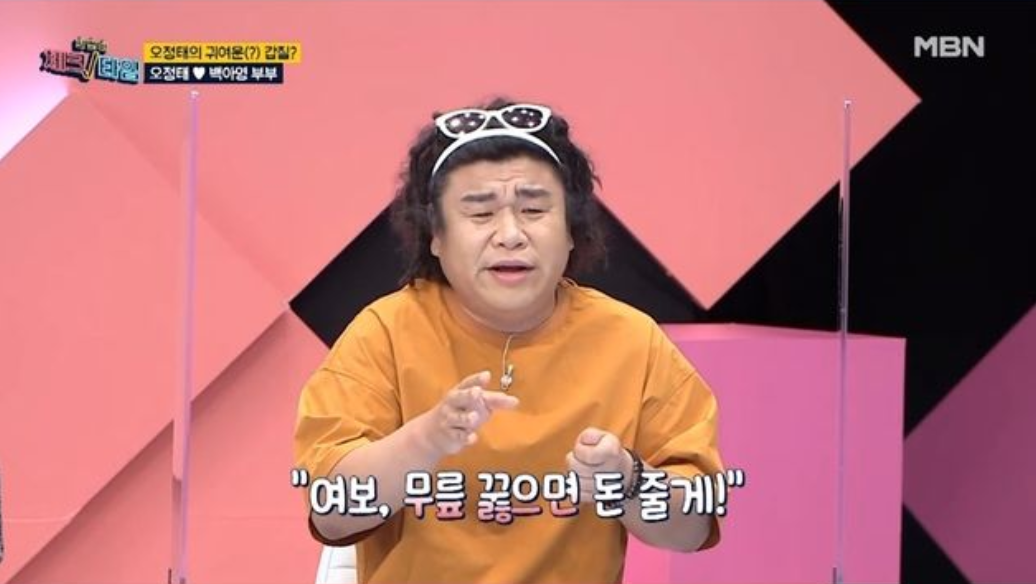 이에 대해 오정태는 "한 달 내내 정말 아내의 구박과 잔소리에 시달리다가 생활비 줄 때만 어깨가 펴진다. 매일 이렇게 돈을 달라고 하니 장난스럽게 '여보 무릎 꿇으면 돈 줄게' 이야기하는 것이다"라며 "그런데 정말로 아내가 바로 무릎을 꿇더라. 얼마나 웃기냐. 재밌게 돈주는 방식이다. 월례 행사일 뿐이다"라고 해명했다.
