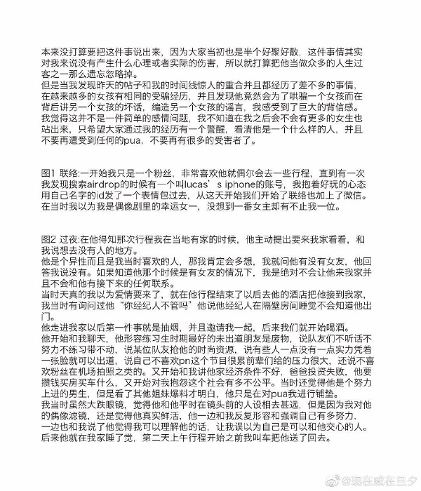 끝으로 "나에게도 옷을 사 오라고 한 적이 있다"며 "난 루카스가 연예인 후광을 이용해 팬들의 사랑은 자신의 욕구를 충족시키기 위해 속이는 행동을 하는 줄 몰랐다. 또 여러 여자를 만나면서 다른 여자들의 험담까지 했다"고 전했습니다.