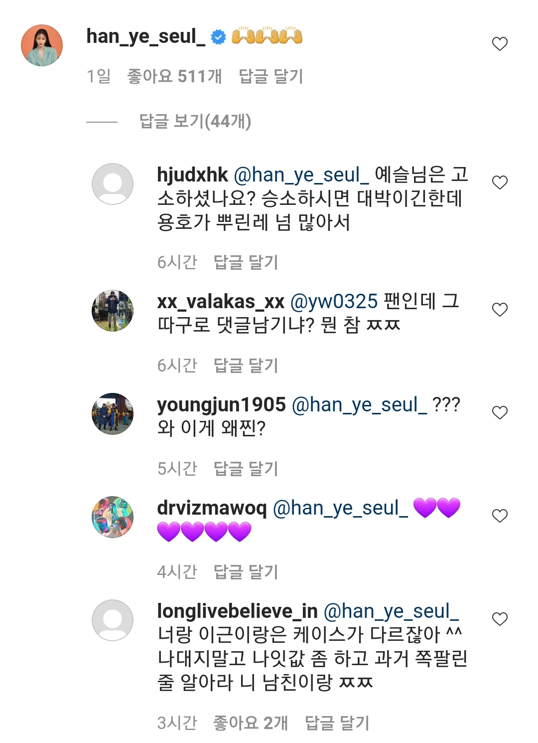 이근의 게시물에 한예슬은 '좋아요'를 누르고 두 손을 들고 환호하는 모양의 이모지를 댓글로 남겼습니다.