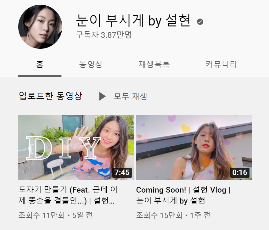 설현이 개설한 '눈이 부시게 by 설현' 채널은 8.31일 구독자 38700명으로 업로드한 영상이 각각 15만회, 11만회 조회수를 기록하고 있습니다.