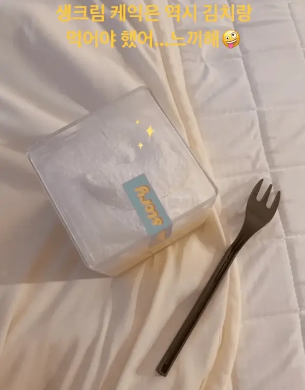 그는 사진과 함께 "생크림 케이크는 역시 김치랑 먹어야 했다"라며 "느끼해"라는 글을 덧붙였습니다.
