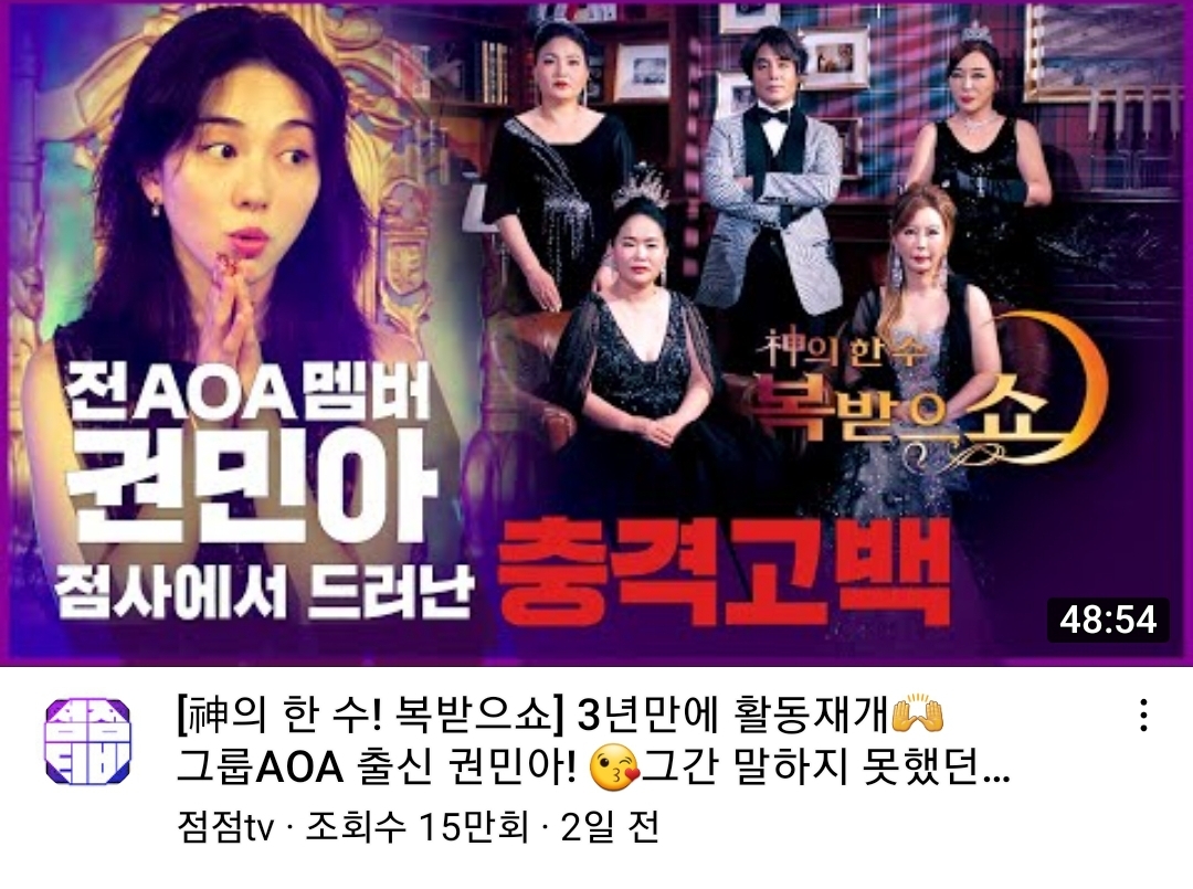 AOA 출신 권민아가 3년만에 무속인들이 진행하는 유튜브 채널 ‘점점TV’에 출연해 “3년 동안 공백기를 가졌던 권민아다”라고 소개했습니다. 이날 권민아는 "친구가 남학생을 만난다고 해 따라