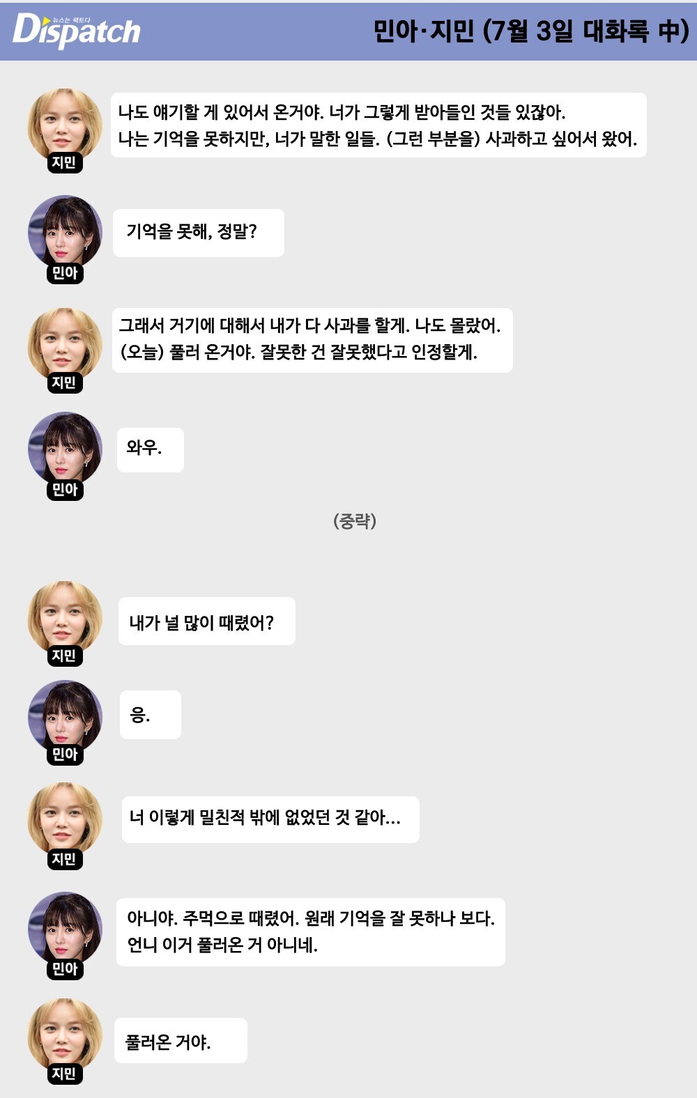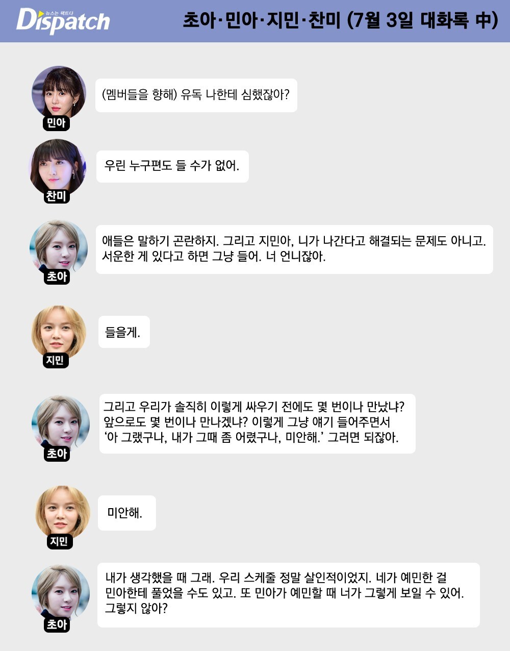 디스패치는 9월 8일 민아와 지민의 대화가 포함된 녹취록을 공개했습니다.