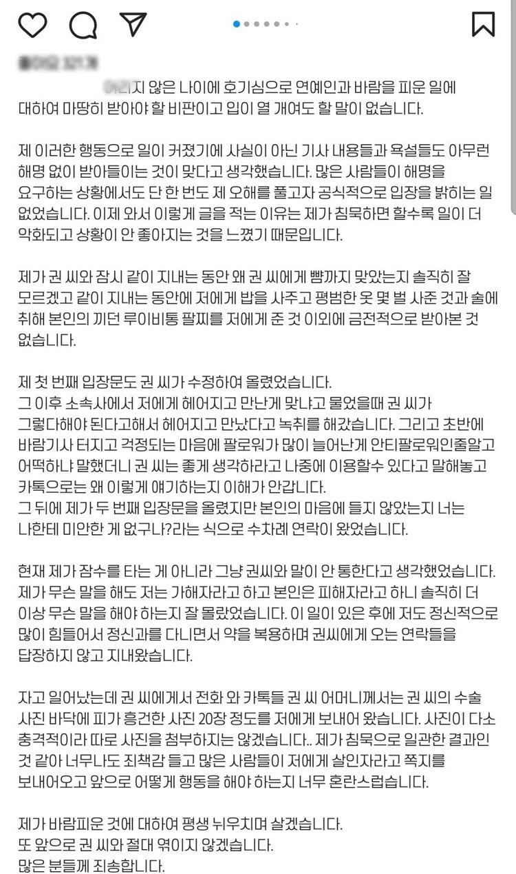 그러면서 "인스타그램으로 구구절절 더이상 안 하겠다. 제가 잘못한 부분들도 인정하고, 되새겨가면서 이야기하겠다. 죄송하다"라고 덧붙였습니다.