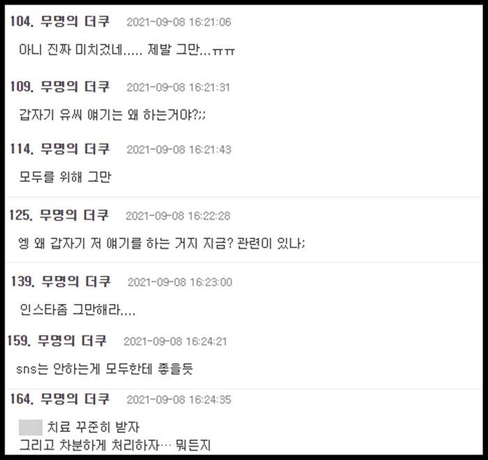 이에 누리꾼들은 "아니 진짜 미치겄네....제발 그만...ㅠㅠ", "갑자기 유씨 얘기는 왜 하는 거야?;;", "모두를 위해 그만", "엥 왜 갑자기 저 얘기를 하는 거지 지금? 관련이 있나", "인스타 좀 그만해라....", "sns는 안 하는 게 모두한테 좋을 듯", "치료 꾸준히 받자. 그리고 차분하게 처리하자…" 등 우려 섞인 댓글을 쏟아냈습니다.