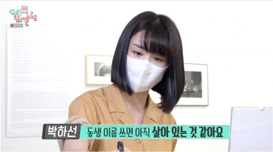 이날 방송에서 박하선은 전시회를 관람하고 방명록을 적으며 지난번에 왔을 때는 죽은 남동생의 이름을 적었다며 방명록을 보여줬습니다.