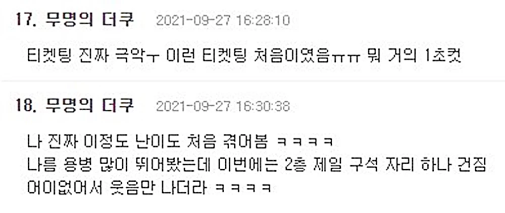 9월 27일 커뮤니티 더쿠에 댓글을 적은 네티즌은 "진짜 이 정도 난이도 처음 겪어봄. 나름 많이 뛰어봤는데 이번에는 2층 제일 구석 자리 하나 건짐. 어이없어서 웃음만 나더라"라고 말했습니다. 다른 네티즌도 "이런 티켓팅 처음이었음. 뭐 거의 1초 컷"이라고 설명했습니다.