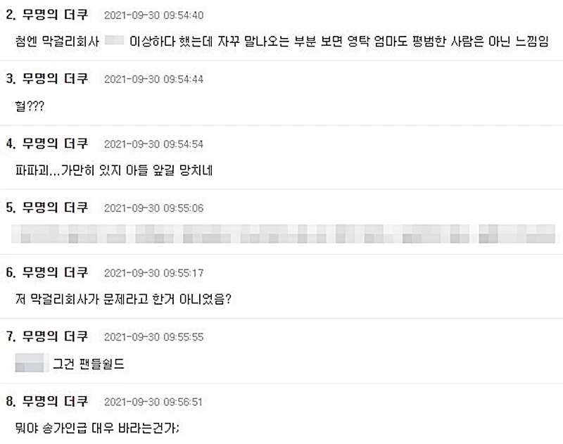 다른 더쿠 네티즌들도 댓글로 "처음에는 막걸리 회사가 이상하다 생각했는데 자꾸 말 나오는 거 보면 영탁 엄마도 평범한 사람은 아닌 느낌", "가만히 있지, 아들 앞길 망치네", "연예인은 가족 조심해야 돼", "영탁 엄마 무속인이라는데 본인 가족 앞날 예견은 못했나" 등의 의견을 남겼습니다.