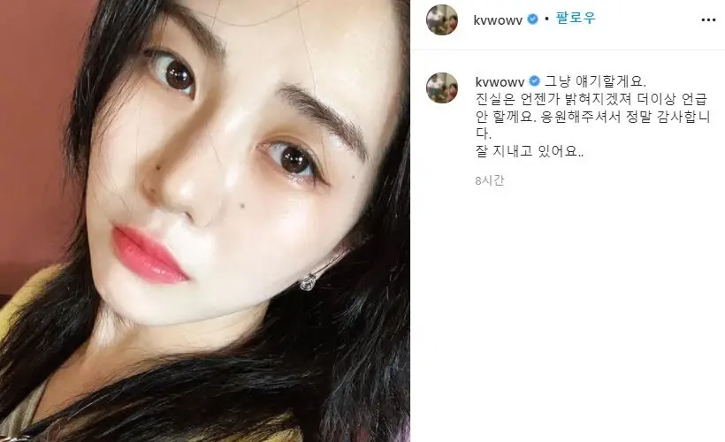 권민아는 지난달 9월 30일 자신의 인스타그램에 본인의 사진과 함께 "그냥 얘기할게요. 진실은 언젠가 밝혀지겠죠"라면서 "더 이상 언급 안 할게요. 응원해 주셔서 정말 감사합니다. 잘 지내고 있어요"라고 적었습니다.