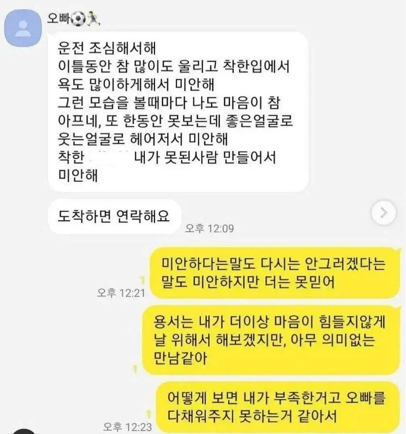 이에 여자친구라고 주장하는 A 씨는 "미안하다는 말도 다신 안 그러겠다는 말도 더는 못 믿는다. 아무 의미 없는 만남 같다"며 "내가 이걸(다른 여자와 나눈 카톡) 보면서 어떤 감정이었을지 헤아려진다면 그냥 끝내자"라며 이별을 고했습니다.