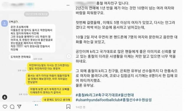 축구 국가대표 홍철(울산현대)의 여자친구라고 주장하는 네티즌이 홍철이 10명이 넘는 여성들과 바람을 피웠다는 사생활을 폭로했습니다.