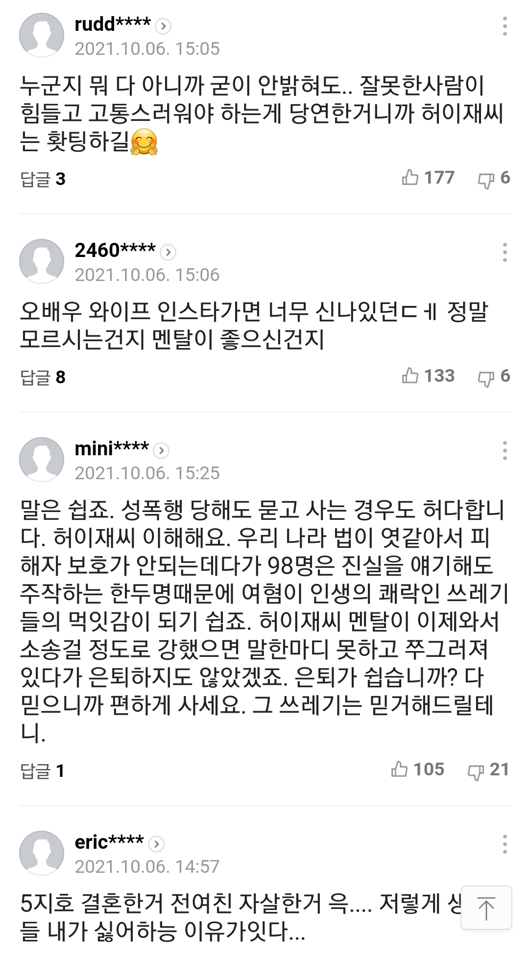 누리꾼들은 "누군지 뭐 다 아니까 굳이 안밝혀도.. 잘못한사람이 힘들고 고통스러워야 하는게 당연한거니까 허이재씨는 홧팅하길🤗","말은 쉽죠. 성폭행 당해도 묻고 사는 경우도 허다합니다. 허이재씨 이해해요. 우리 나라 법이 엿같아서 피해자 보호가 안되는데다가 98명은 진실을 얘기해도 주작하는 한두명때문에 여혐이 인생의 쾌락인 쓰레기들의 먹잇감이 되기 쉽죠. 허이재씨 멘탈이 이제와서 소송걸 정도로 강했으면 말한마디 못하고 쭈그러져 있다가 은퇴하지도 않았겠죠. 은퇴가 쉽습니까? 다 믿으니까 편하게 사세요. 그 쓰레기는 믿거해드릴테니" 등의 댓글로 허이재를 응원했습니다.