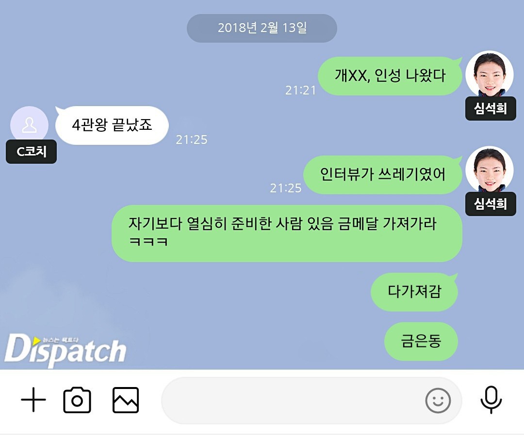 디스패치는 2018년 2월 평창동계올림픽 기간 동안 심석희가 당시 코치였던 A씨와 나눈 카카오톡 대화를 최근 공개했습니다.