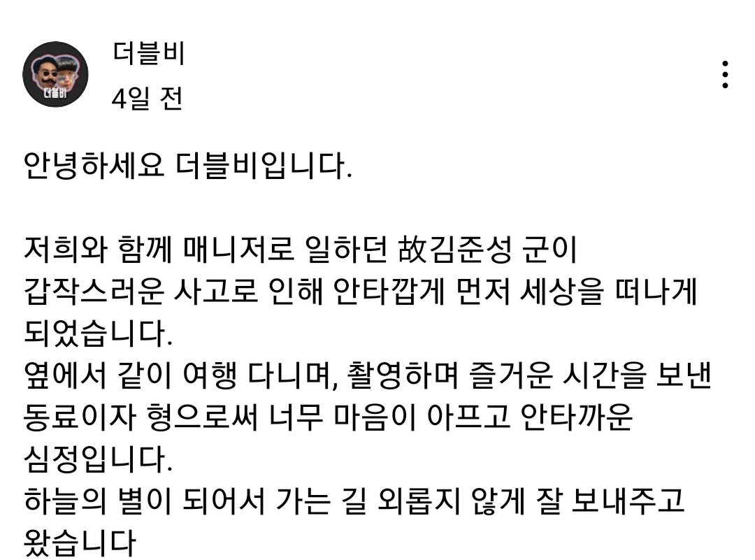 지난 11월 9일 유튜브 채널 '더블비' 커뮤니티에 그동안 함께한 김준성 매니저의 비보를 알리는 장문이 게재됐습니다.