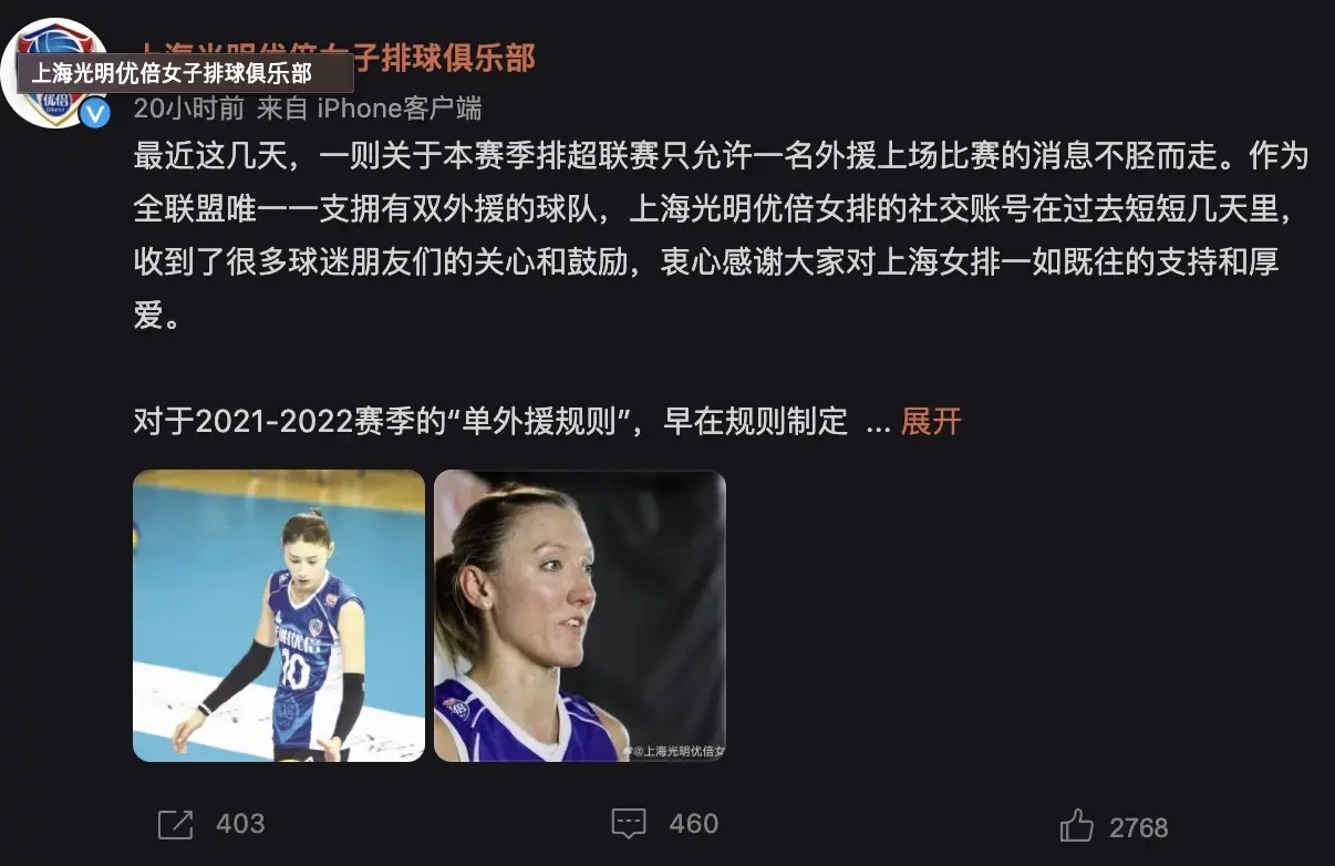 상하이팀은 지난 11월 22일 오후 웨이보 공식 홈페이지를 통해 "최근 며칠간 이번 시즌 슈퍼리그에서 한 명의 외국인 선수만 경기에 출전할 수 있다는 소문이 파다했다. 상하이 여자배구단은 고심 끝에 중국배구협회의 새 규정을 지지하기로 했다"고 공지를 올렸습니다.