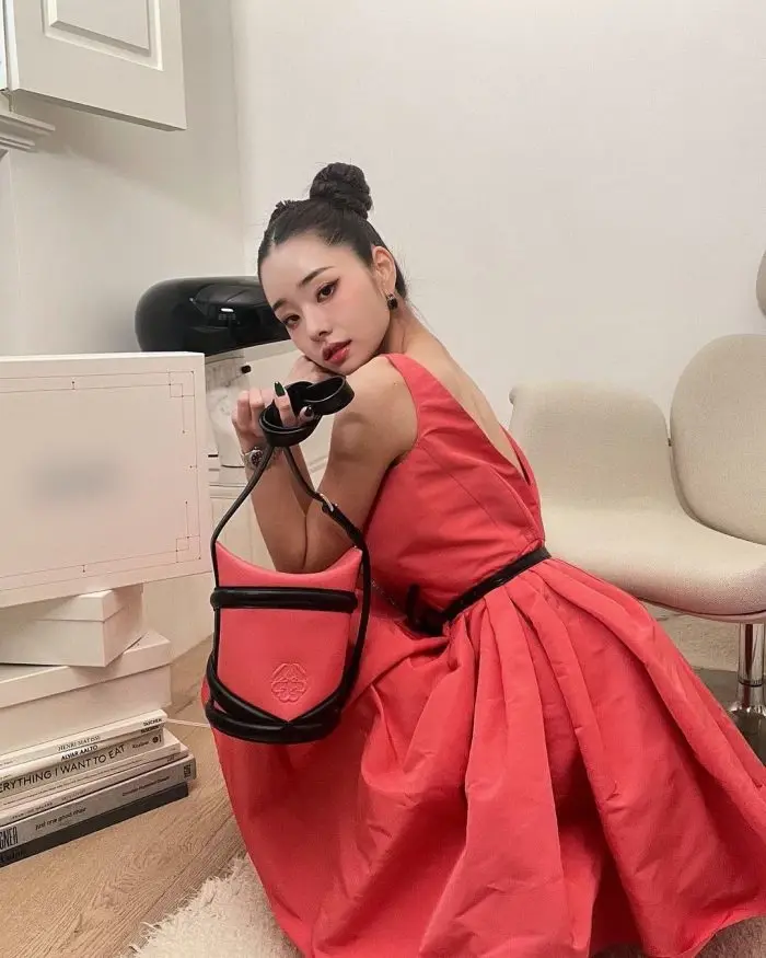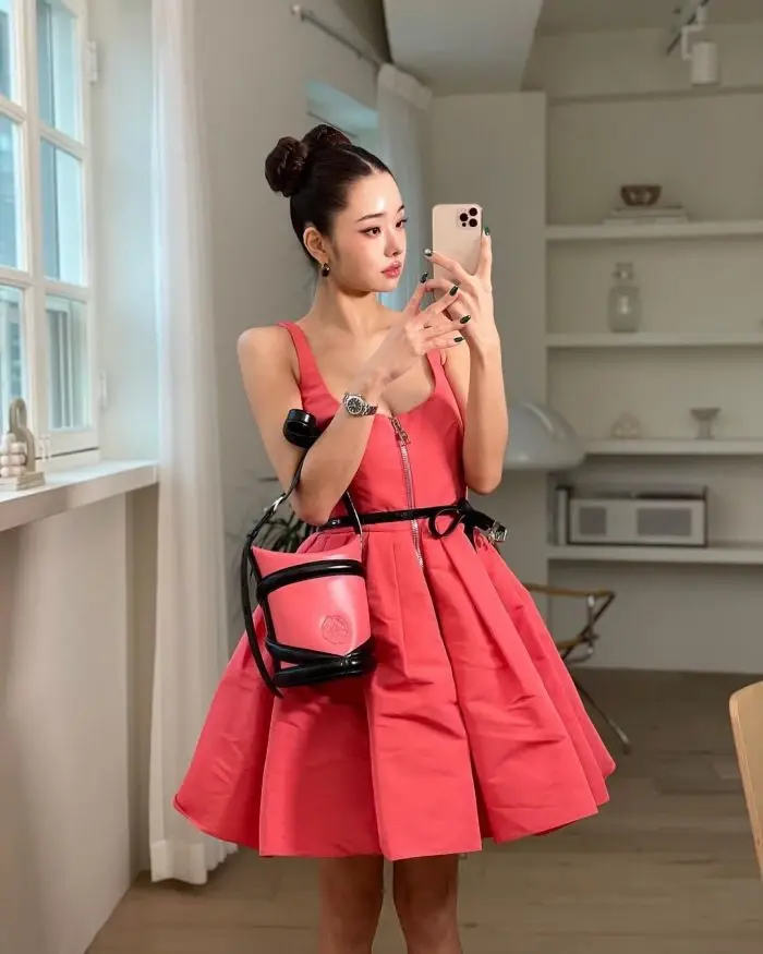 사진 속 프리지아는 스퀘어넥으로 깊게 파인 다홍색 미니 드레스를 입고 다양한 포즈를 취하고 있습니다.