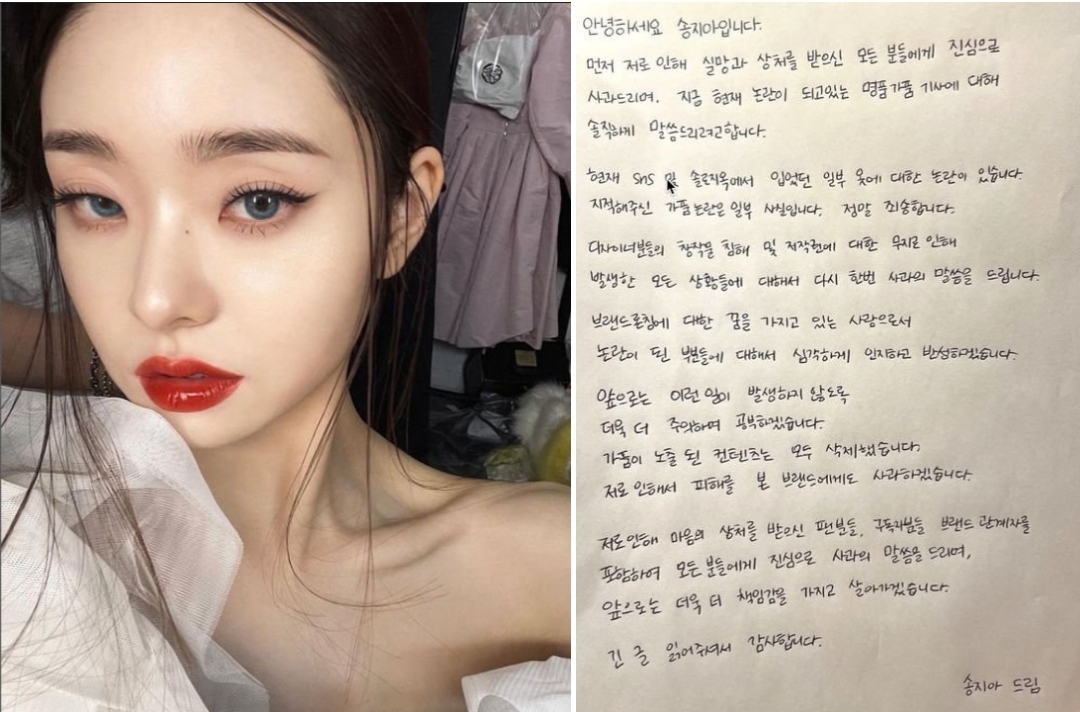 편지에서 송지아는 "먼저 저로 인해 실망과 상처를 받으신 모든 분들에게 진심으로 사과드리며, 지금 현재 논란이 되고 있는 명품 가품 기사에 대해 솔직하게 말씀드리려 한다"고 밝혔습니다.