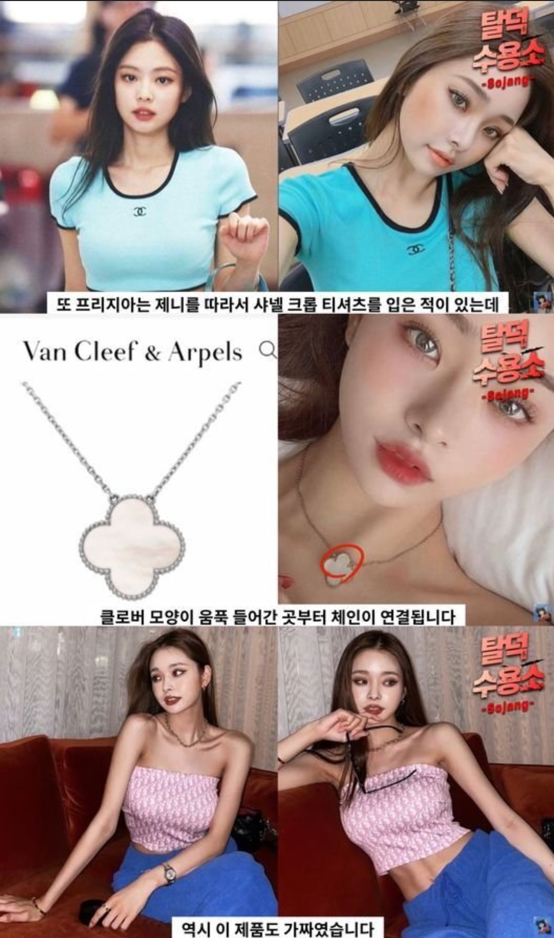 프리지아가 착용했던 네잎 클로버 모양의 목걸이는 프랑스 브랜드 반플리프 아펠의 대표적인 디자인으로 해당 게시물에는 프리지아의 목걸이가 진품이 아닌 것 같다는 다수의 댓글이 달렸습니다. 실제 목걸이 체인의 연결 부분은 클로버 윗부분에서 시작되지만, 송지아가 착용한 목걸이는 움푹 들어간 부분에서 시작되기 때문이었습니다.