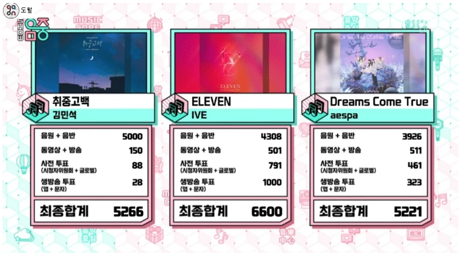 아이브는 쟁쟁한 1위 후보들 사이에서 ‘ELEVEN(일레븐)’으로 1위를 차지했습니다. 데뷔 7일 만에 MBC M, MBC 에브리원 ‘쇼! 챔피언’에서 처음으로 1위라는 쾌거를 이뤘던 아이브는 SBS MTV, SBS FiL ‘더쇼’, KBS 2TV ‘뮤직뱅크’, ‘쇼! 음악중심’, SBS ‘인기가요’까지 각종 음악방송을 휩쓸며 10관왕이라는 기염을 토했습니다.
