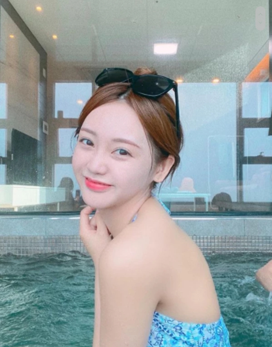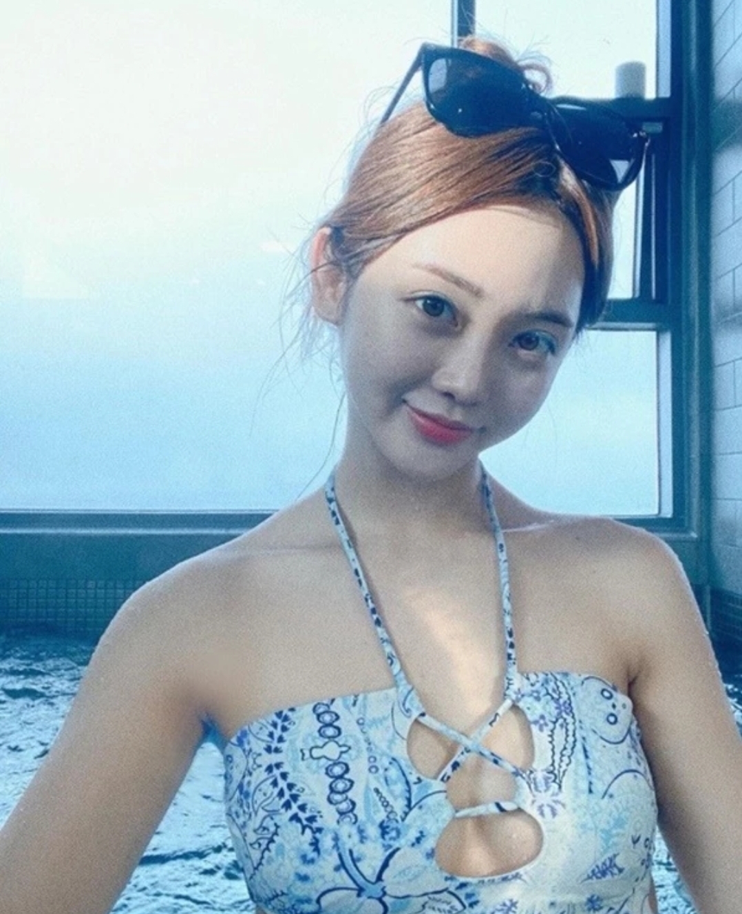 사진 속 홍지윤은 수영장에서 포즈를 취하고 있는 모습입니다.